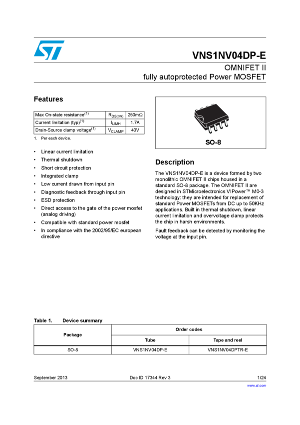 VNS1NV04DPTR-E Power Switch Lo Side 1.7A 8-Pin SO N T/R