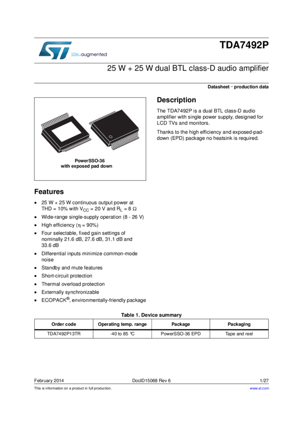 TDA7492P13TR Audio Amp Speaker 2-CH Stereo 25W Class-D 36-Pin PowerSSO EP T/R