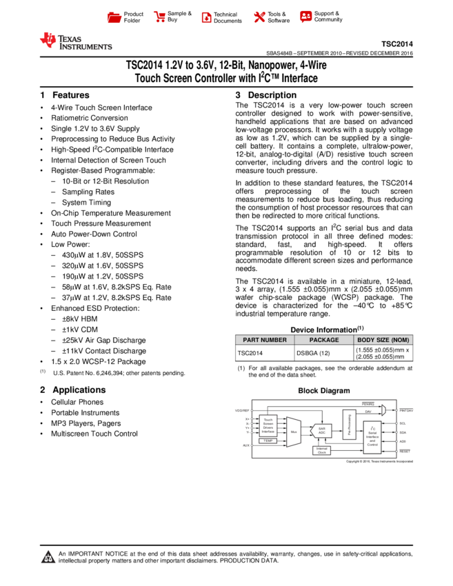 TSC2014IYZGR Touch Screen Controller 12-Pin DS-BGA T/R