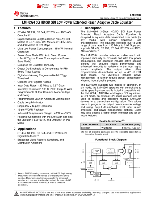 LMH0394SQE/NOPB Low Power Extended Reach Adaptive Cable Equalizer 16-Pin LLP EP T/R