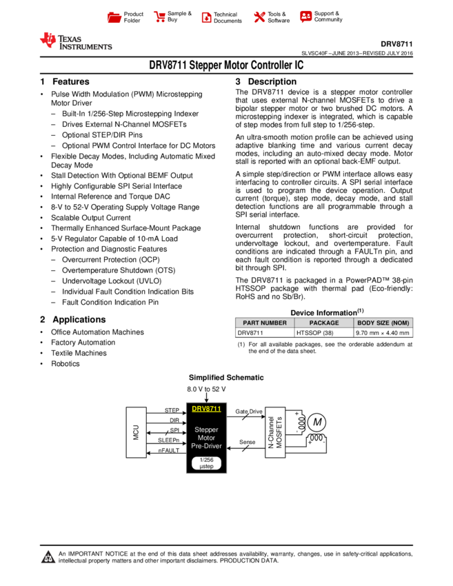 DRV8711DCPR Stepper Motor Controller 8V to 52V 38-Pin HTSSOP T/R