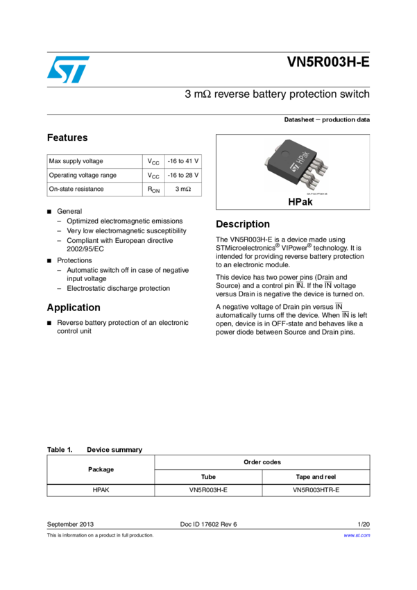 VN5R003HTR-E Power Switch 60A 7-Pin(6+Tab) HPAK T/R