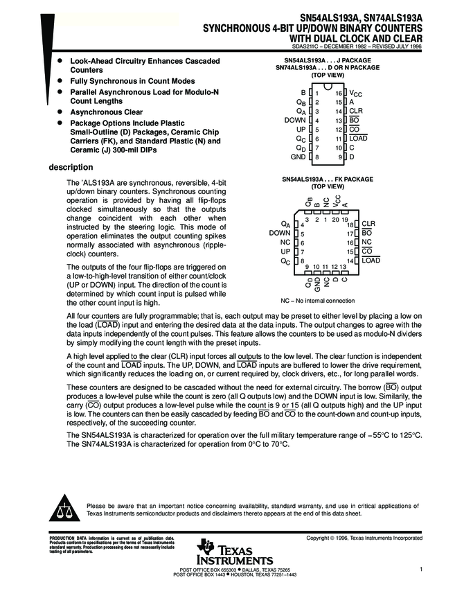 SN74ALS193AN Counter Single 4-Bit Binary UP/Down 16-Pin PDIP Tube