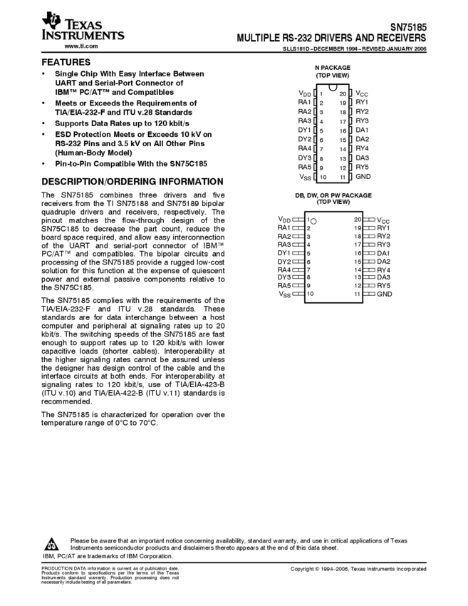 SN75185N Triple Transmitter Quint Receiver RS-232 20-Pin PDIP Tube