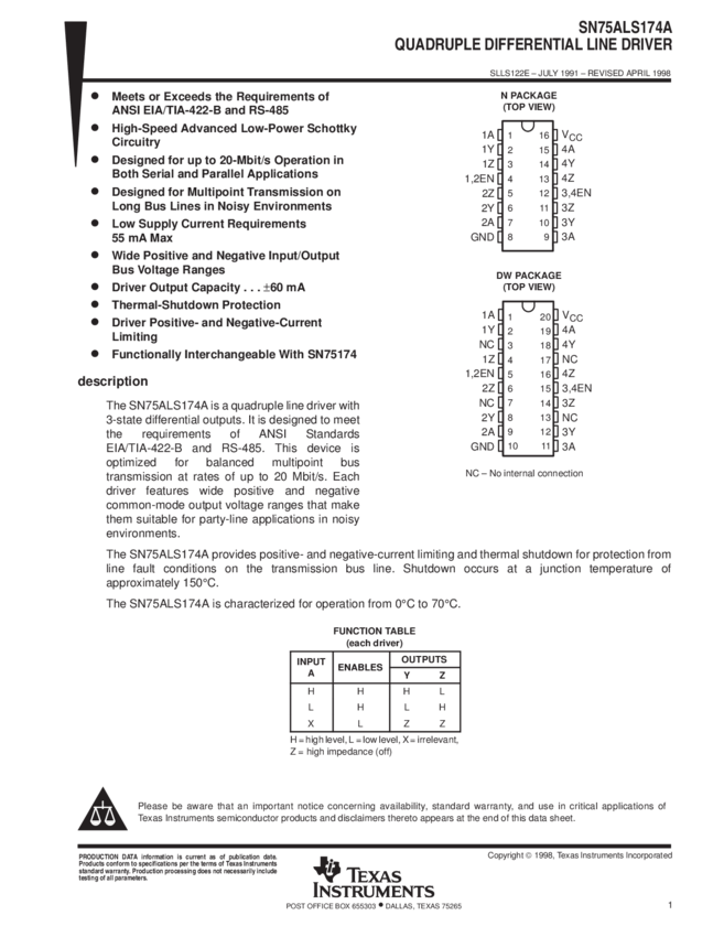 SN75ALS174ADWR Quad Transmitter RS-422/RS-485 20-Pin SOIC T/R