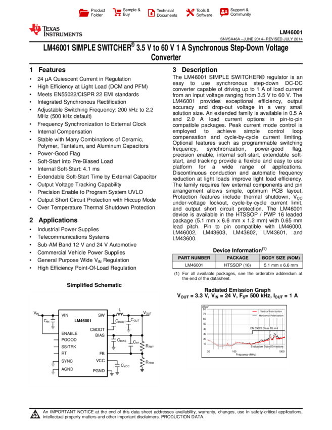 LM46001PWPR Conv DC-DC Single Step Down 3.5V to 60V 16-Pin HTSSOP T/R