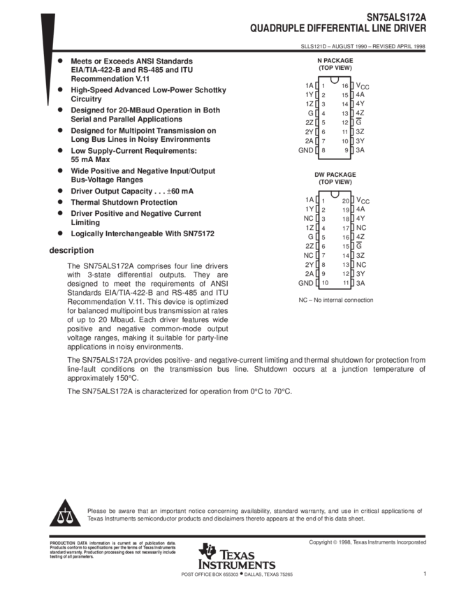 SN75ALS172ADWR Quad Transmitter RS-422/RS-485 20-Pin SOIC T/R