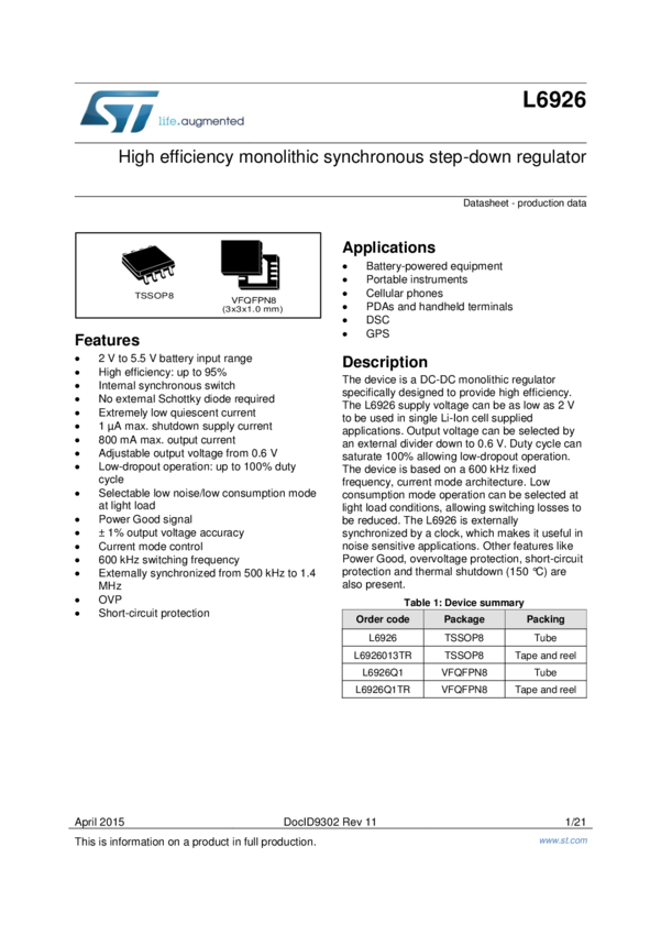 L6926013TR Conv DC-DC Single Step Down 2V to 5.5V 8-Pin MSOP T/R