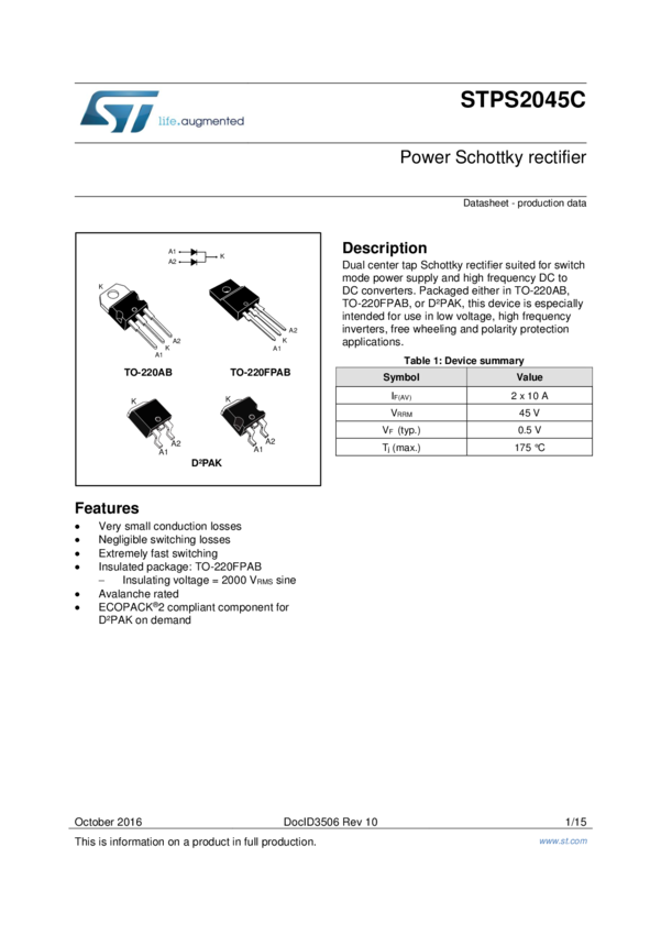 STPS2045CG-TR Diode Schottky 45V 20A 3-Pin(2+Tab) D2PAK T/R