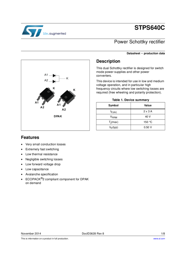 STPS640CB-TR Diode Schottky 40V 3A 3-Pin(2+Tab) DPAK T/R