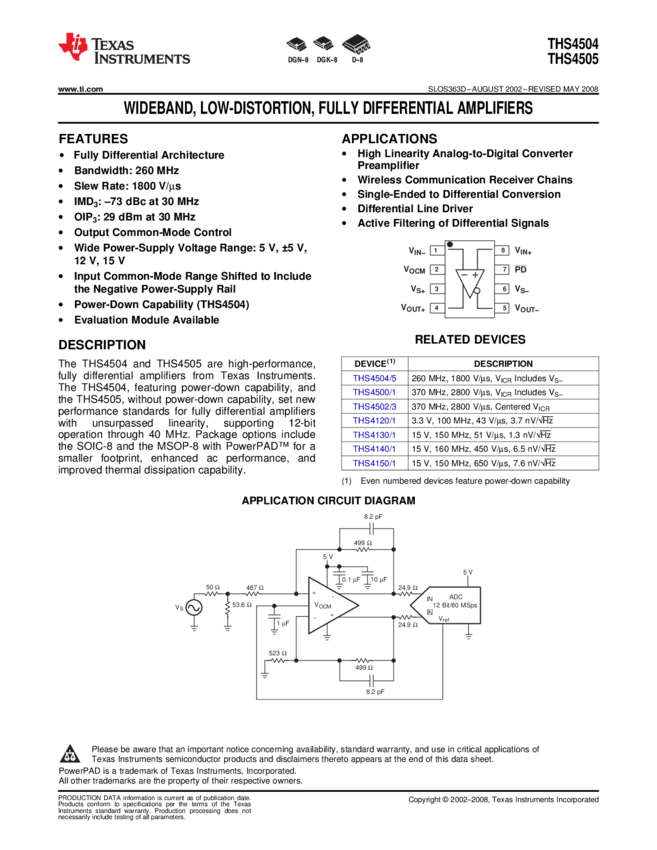 THS4505DR SP Amp DIFF AMP Single ±7.5V/15V 8-Pin SOIC T/R