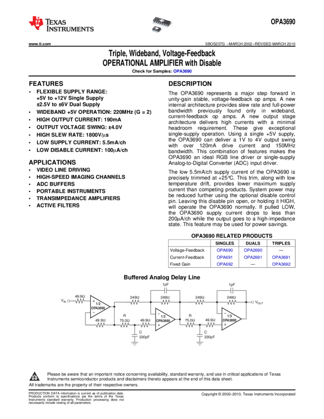 OPA3690IDBQT OP Amp Triple Volt Fdbk ±6V/12V 16-Pin SSOP T/R