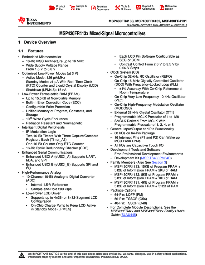 MSP430FR4133IG56R MCU 16-Bit MSP430 RISC 15.5KB FRAM 2.5V/3.3V 56-Pin TSSOP T/R