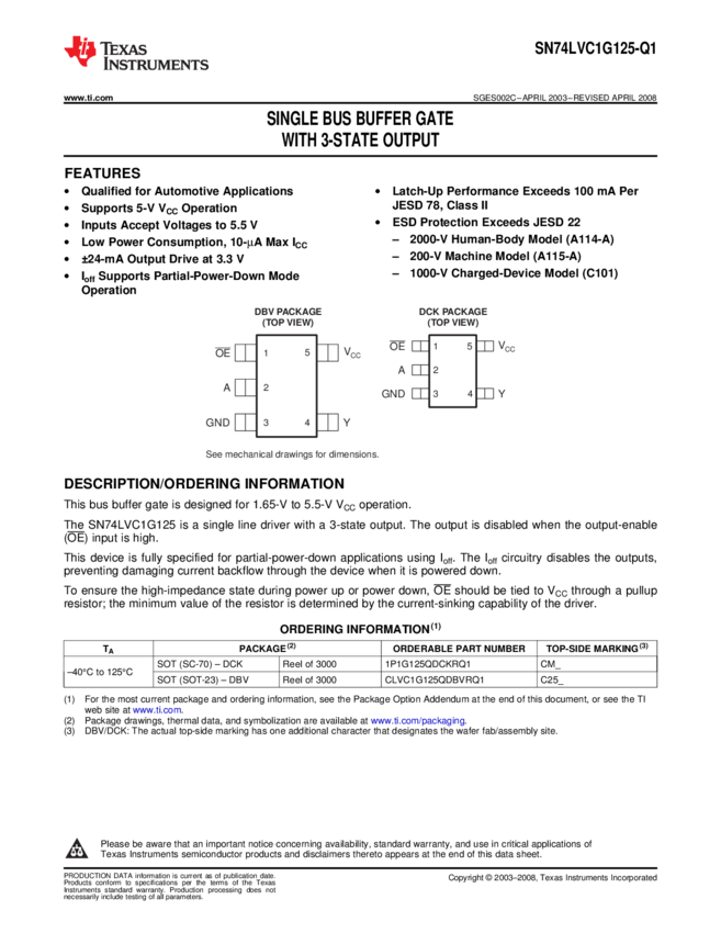 1P1G125QDCKRQ1 Buffer/Line Driver 1-CH Non-Inverting 3-ST CMOS 5-Pin SC-70 T/R