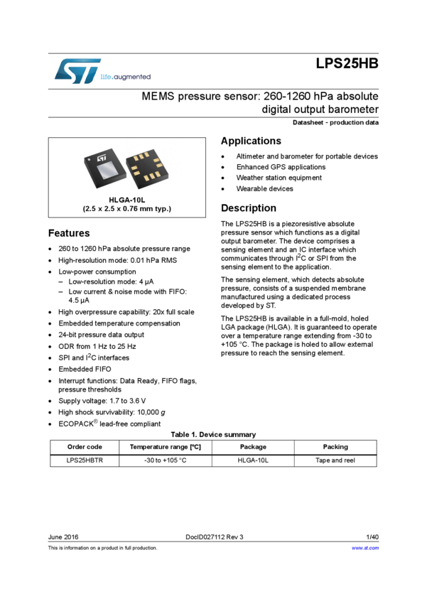 LPS25HBTR Pressure Sensor 26kPa to 126kPa Absolute 10-Pin HLGA T/R