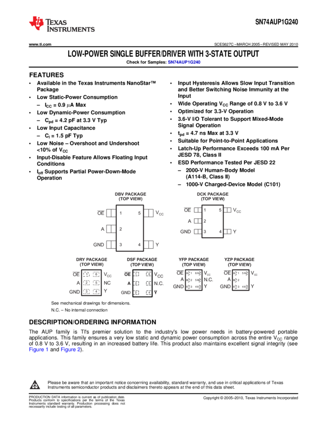 SN74AUP1G240DCKR Buffer/Line Driver 1-CH Inverting 3-ST CMOS 5-Pin SC-70 T/R