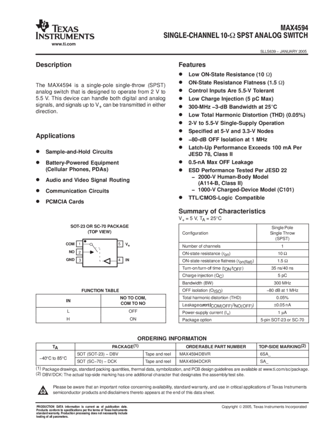 MAX4594DCKR Analog Switch Single SPST 5-Pin SC-70 T/R