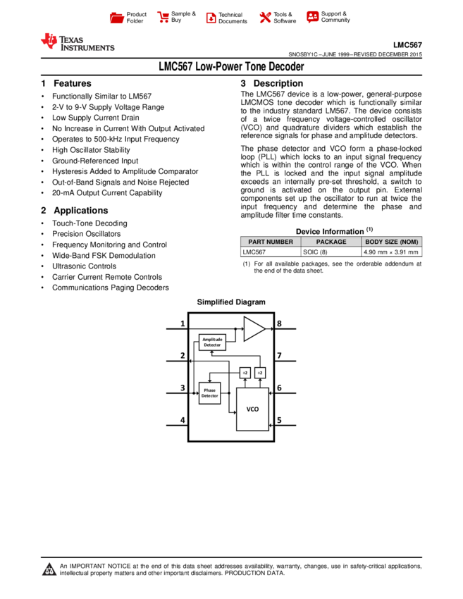 LMC567CMX/NOPB Tone Decoder 8-Pin SOIC N T/R