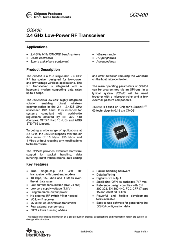 CC2400RSUR RF Transceiver FSK 1.8V/2.5V/3.3V 48-Pin QFN EP T/R