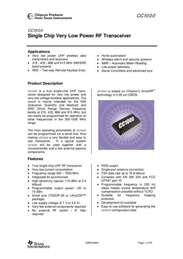 CC1000-RTR1 RF Transceiver FSK 3V 28-Pin TSSOP T/R
