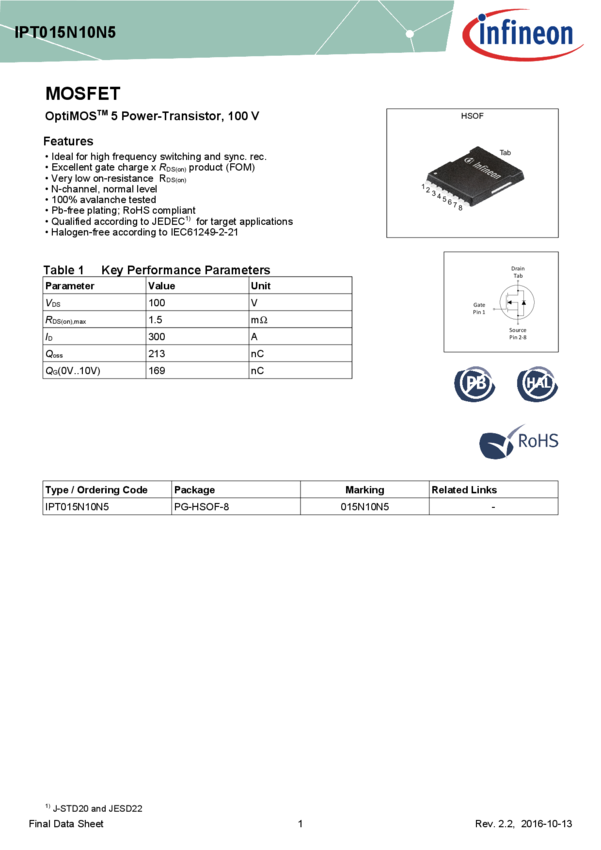 IPT015N10N5ATMA1 Trans MOSFET N-CH 100V 243A 8-Pin HSOF T/R