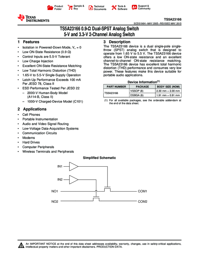 TS5A23166YZTR Analog Switch Dual SPST 8-Pin DSBGA T/R