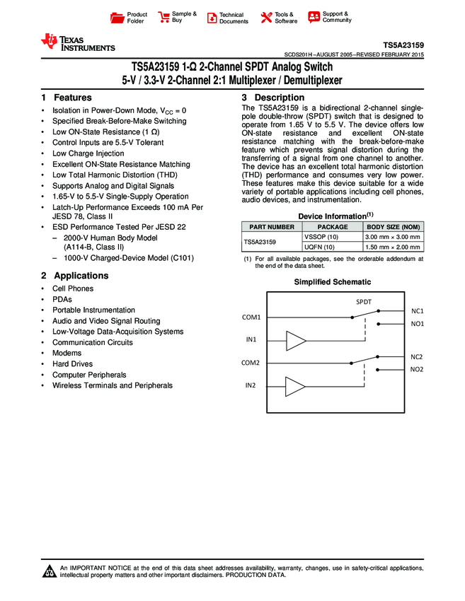 TS5A23159RSER Analog Switch Dual SPDT 10-Pin UQFN T/R