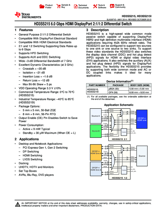 HD3SS215RTQT HDMI Differential Switch 56-Pin QFN T/R
