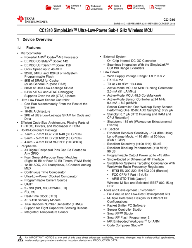 CC1310F128RGZR MCU 32-Bit SimpleLink ARM Cortex M3 RISC 64KB Flash 2.5V/3.3V 32-Pin VQFN E...