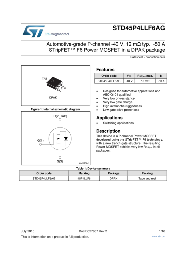 STD45P4LLF6AG Trans MOSFET P-CH 40V 50A 3-Pin DPAK T/R