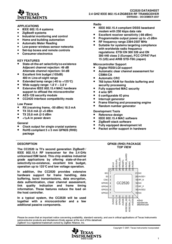CC2520RHDR ZigBee/802.15.4 Modules 2507MHz 250Kbps 28-Pin VQFN EP T/R