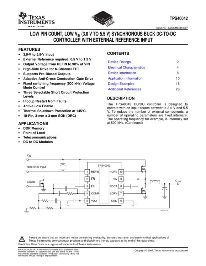 TPS40042DRCT DC DC Cntrlr Single-OUT Sync Buck 3V to 5.5V Input 10-Pin VSON EP T/R