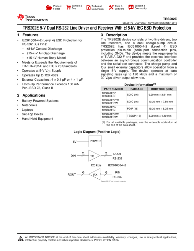 TRS202ECDR Dual Transmitter/Receiver RS-232 16-Pin SOIC T/R