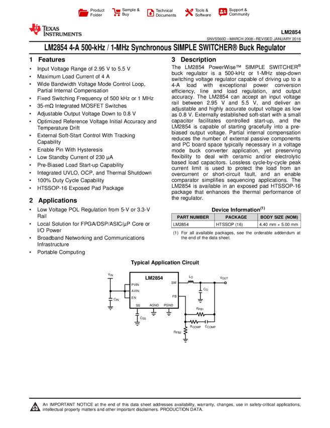 LM2854MHX-500/NOPB Conv DC-DC Single Step Down 2.95V to 5.5V 16-Pin TSSOP EP T/R