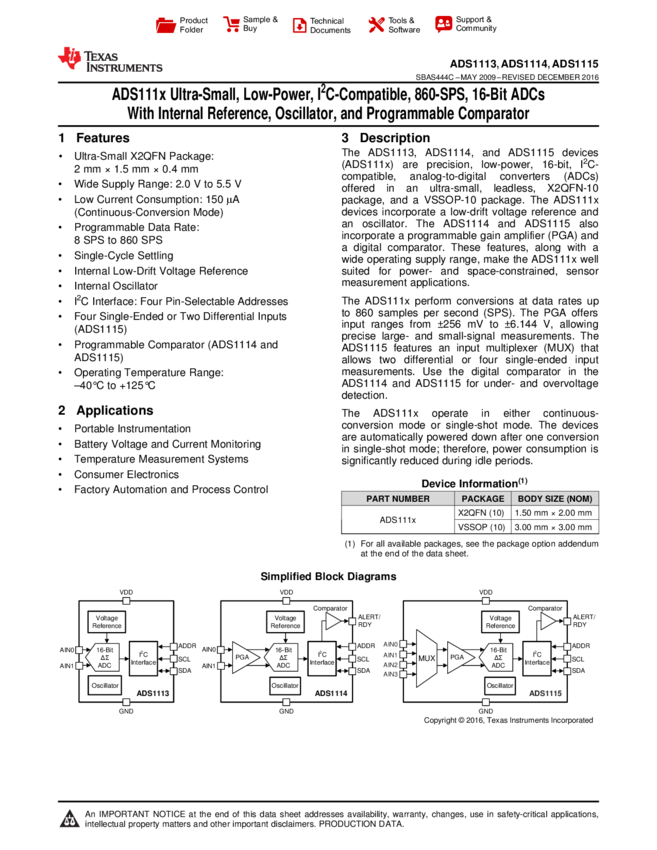 ADS1115IDGST ADC Single Delta-Sigma 860sps 16-bit Serial 10-Pin VSSOP T/R