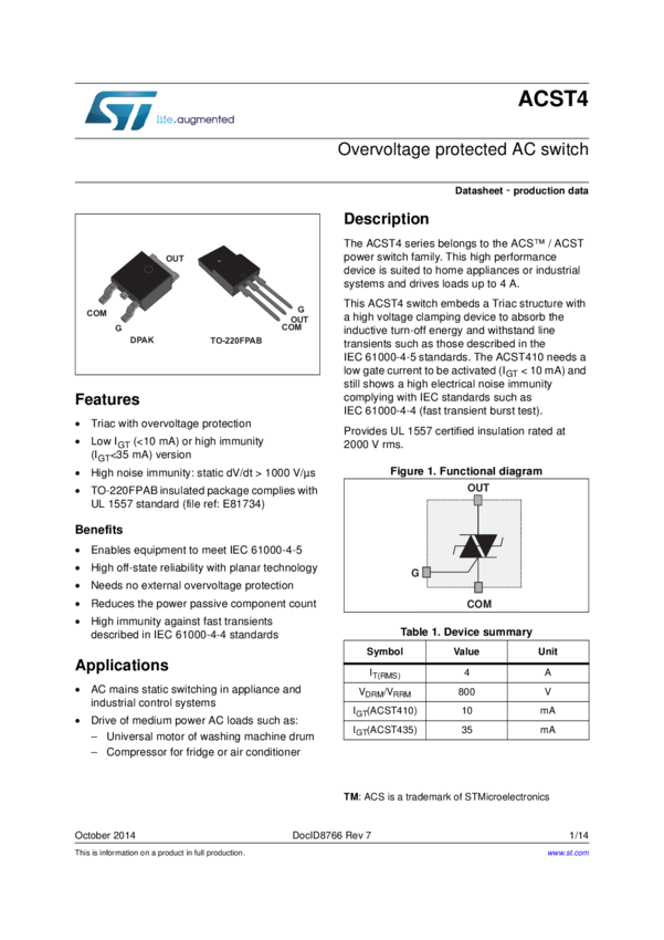ACST435-8BTR Thyristor TRIAC 800V 32A 3-Pin(2+Tab) DPAK T/R