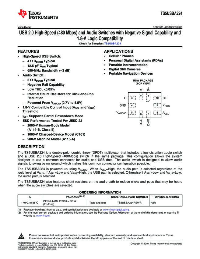 TS5USBA224RSWR Audio Switch IC 10-Pin UQFN T/R