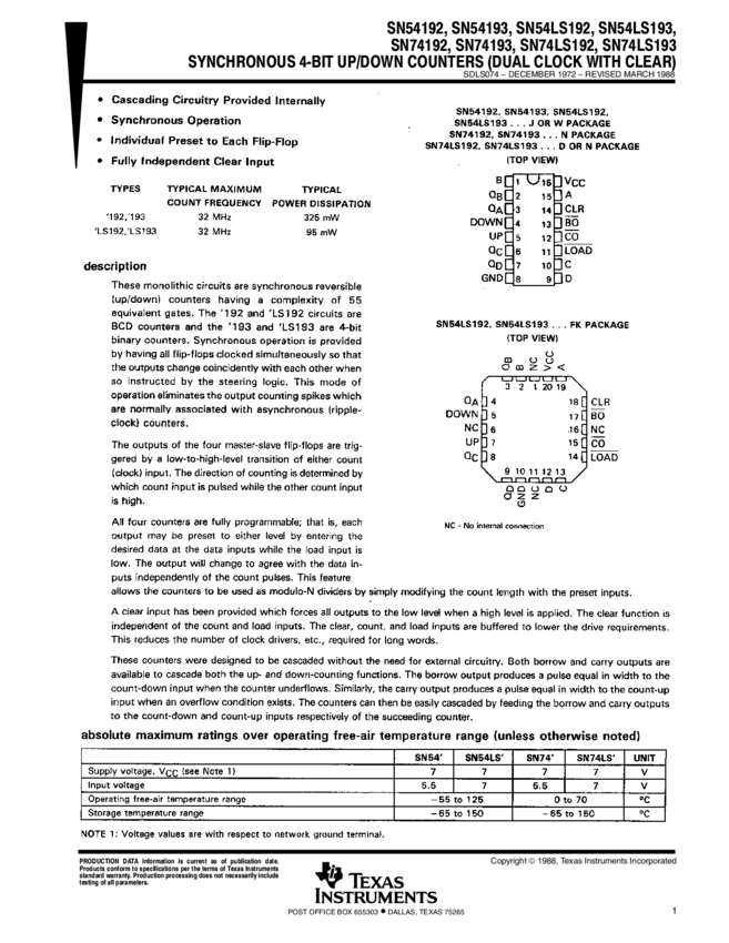 SN74LS193D, SNJ54LS193J, SNJ54192J, SNJ54192W