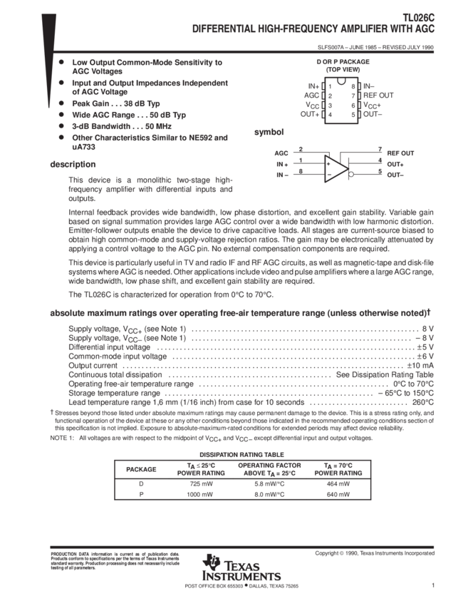 TL026CP OP Amp Single GP ±8V 8-Pin PDIP Tube