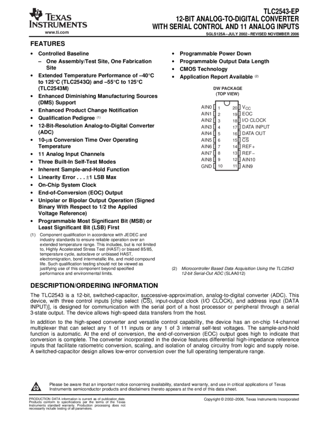TLC2543QDWREP ADC Single SAR 66ksps 12-bit Serial 20-Pin SOIC T/R