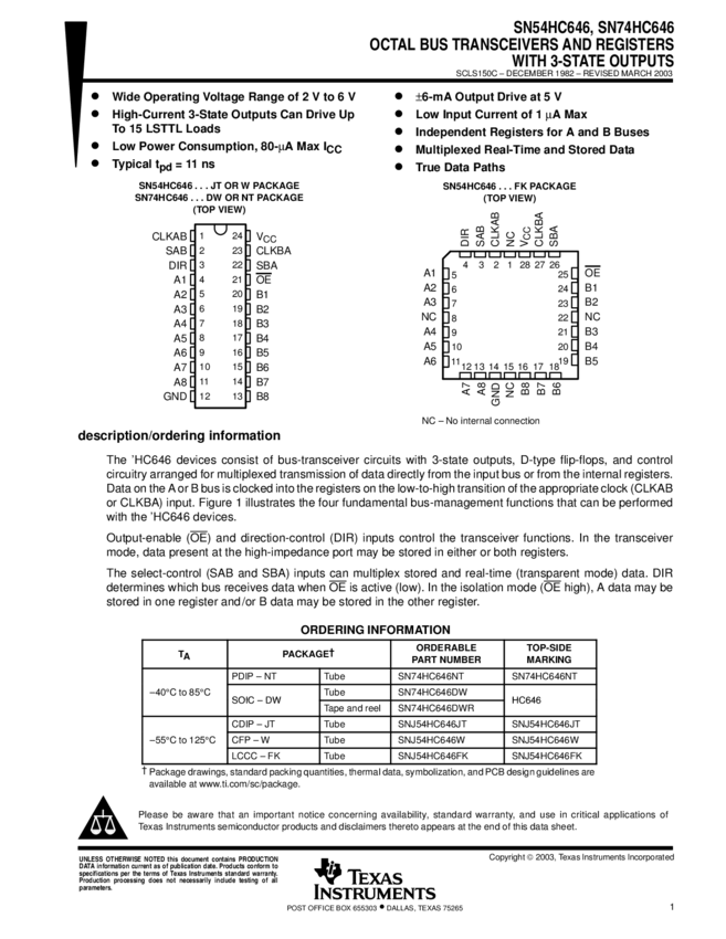 SN74HC646DW Bus XCVR Single 8-CH 3-ST 24-Pin SOIC Tube