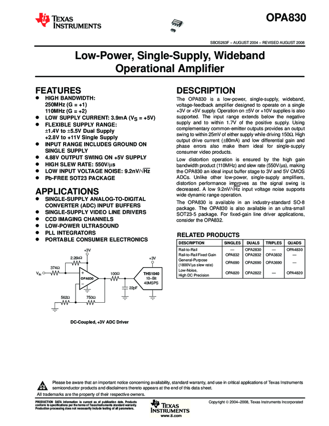 OPA830IDR OP Amp Single Volt Fdbk ±5.5V/11V 8-Pin SOIC T/R