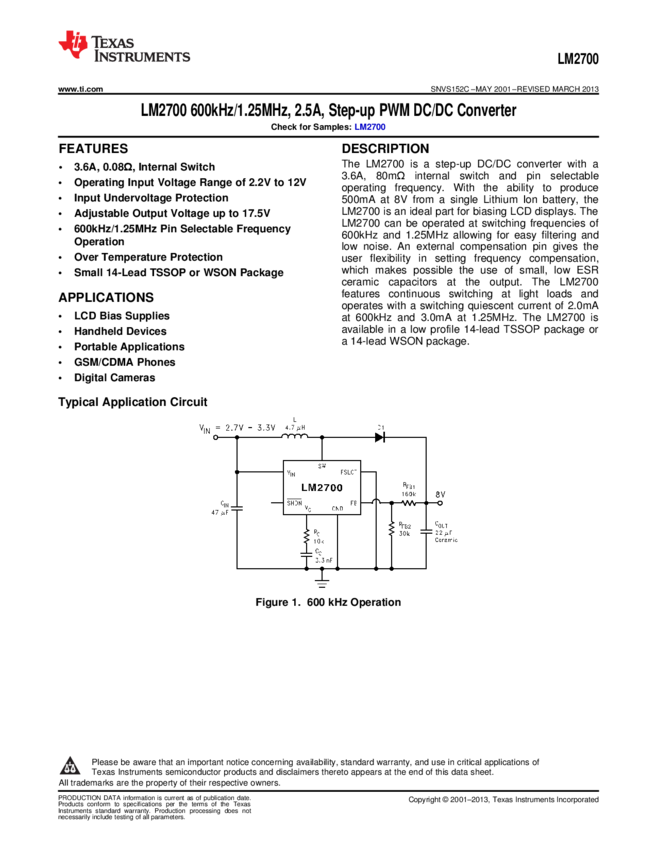 LM2700LD-ADJ/NOPB Conv DC-DC Single Step Up 2.2V to 12V 14-Pin LLP EP T/R
