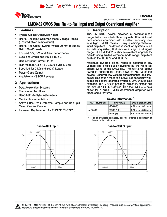 LMC6482AIN/NOPB OP Amp Dual GP R-R I/O 15.5V 8-Pin PDIP Rail