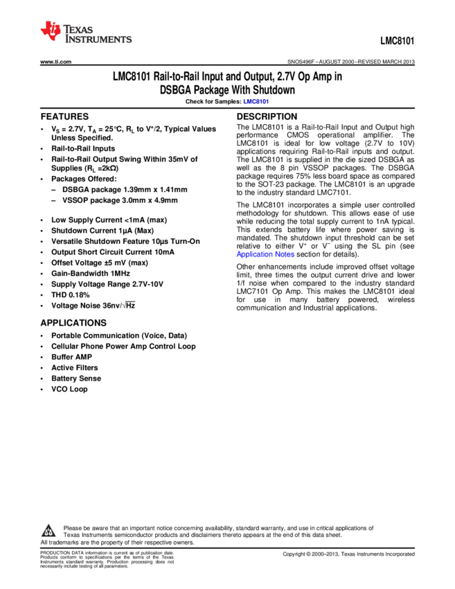LMC8101TPX/NOPB OP Amp Single GP R-R I/O ±5V/10V 8-Pin uSMD T/R