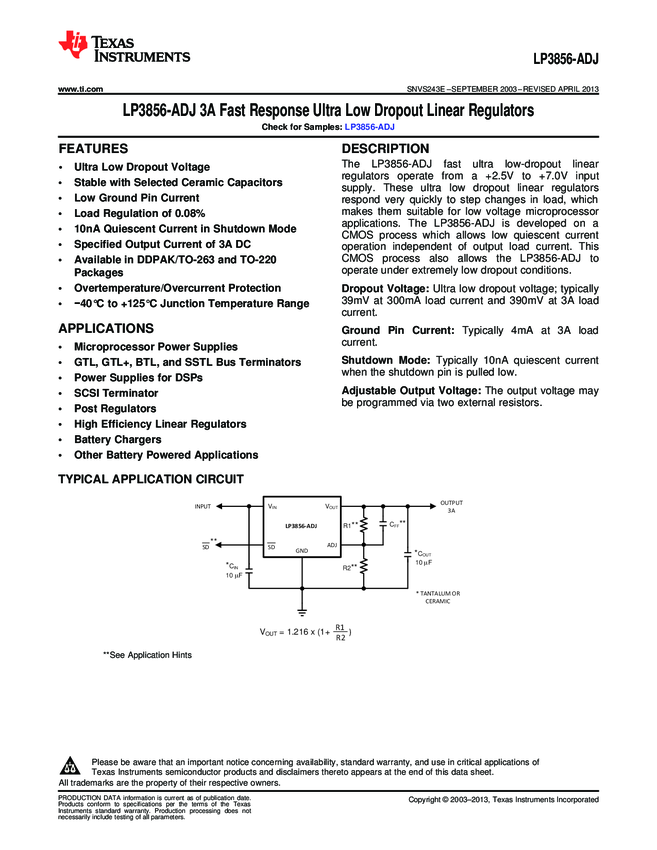 LP3856ESX-ADJ/NOPB LDO Regulator Pos 3A 6-Pin(5+Tab) TO-263 T/R