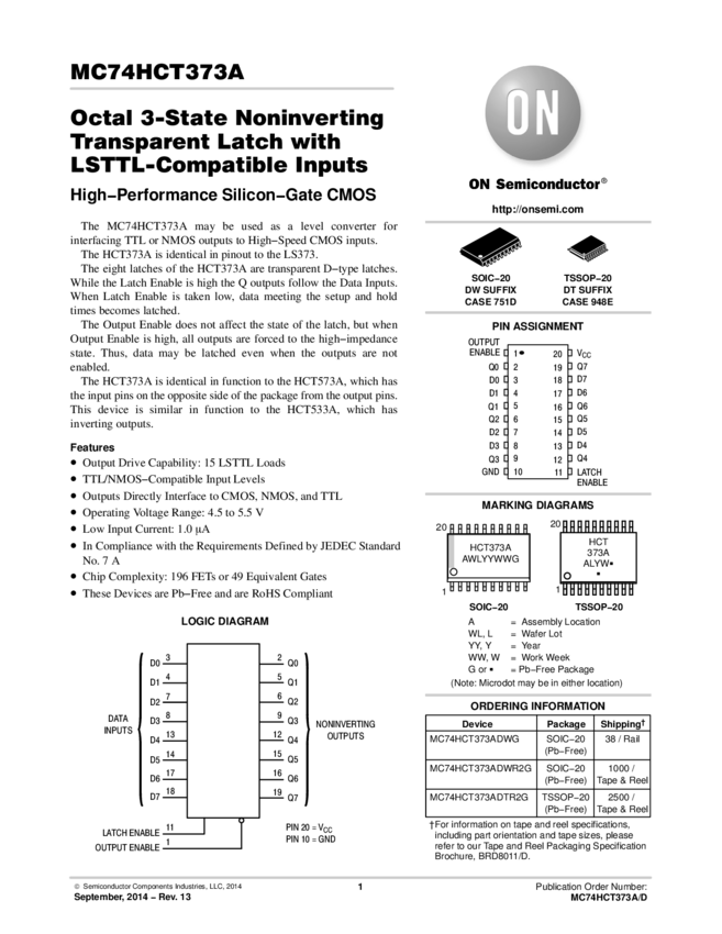 MC74HCT373ADTR2G Latch Transparent 3-ST 8-CH D-Type 20-Pin TSSOP T/R