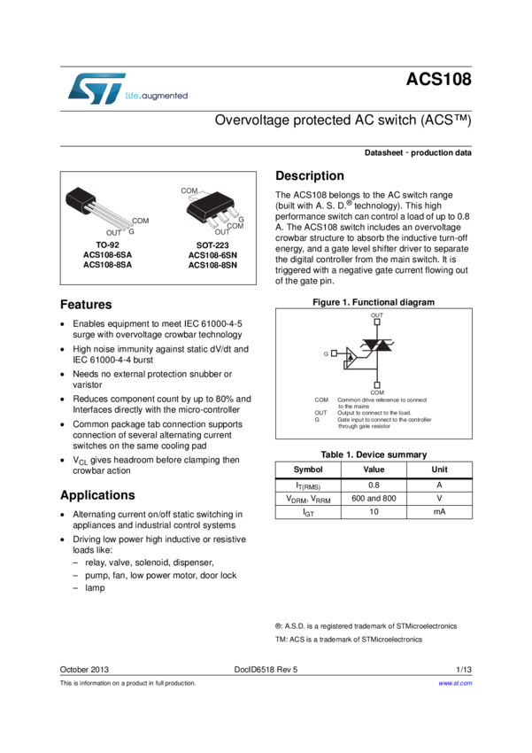 ACS108-6SA-AP Overvoltage Protected AC Switch 3-Pin TO-92 Ammo