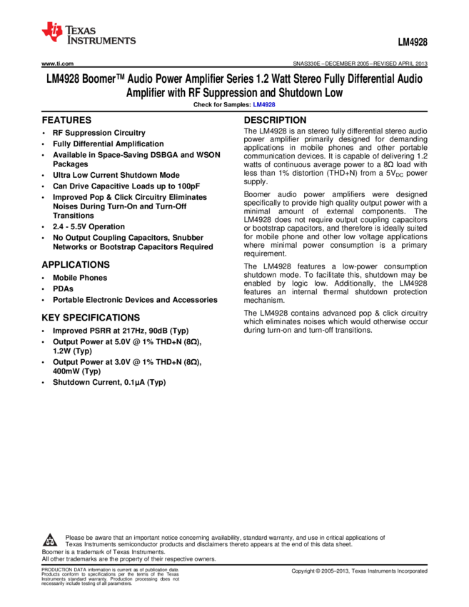 LM4928SD/NOPB Audio Amp Speaker 2-CH Stereo 2.2W Class-AB 14-Pin LLP EP T/R
