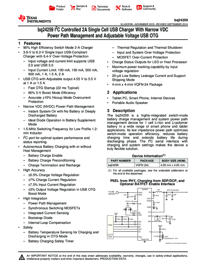 BQ24259RGET Battery Charger Li-Ion/Li-Polymer 3500mA 24-Pin VQFN T/R
